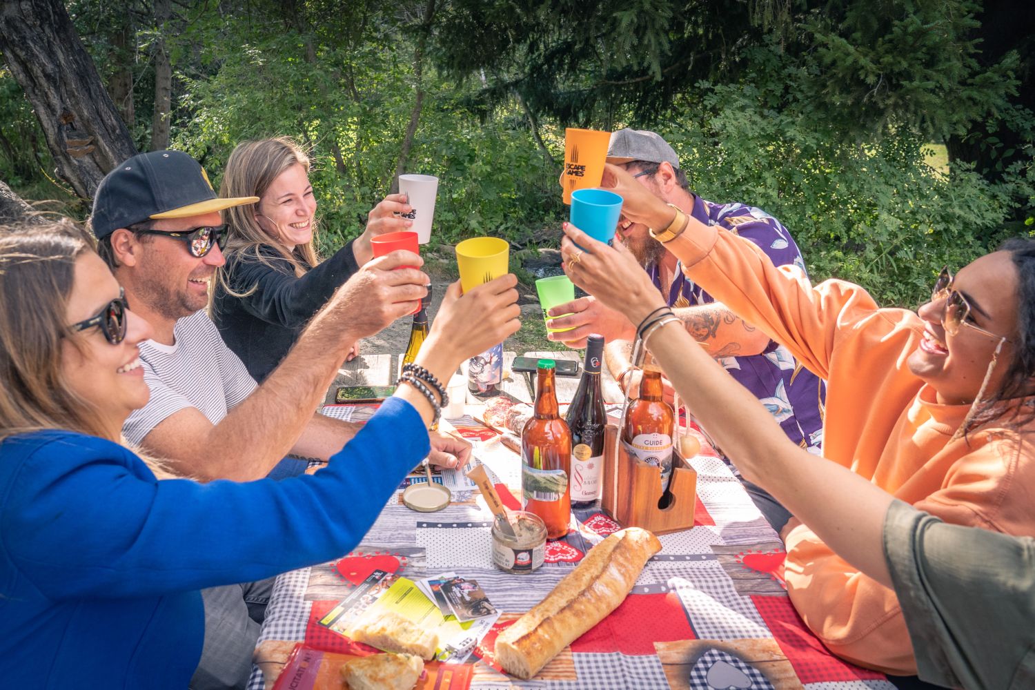2 bières, 1 vin* + 1 soft, 1 saucisson*, 1 terrine, 1 tapenade, 400 g de fromage, 1 paquet de chips, du pain, dessert et surprises*. |